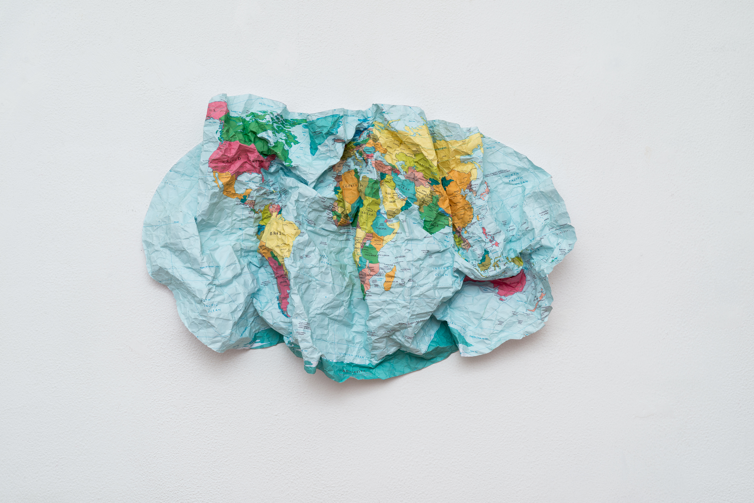 Although while reading the installation this moment can be considered as an interesting action to share with the viewer, Fontenla chose to make it with an introspective gesture that was repeated many times in the gestation of many of her works. With the planisphere destroyed, a video is projected with the terrestrial map crumpled like a sheet to be thrown away.