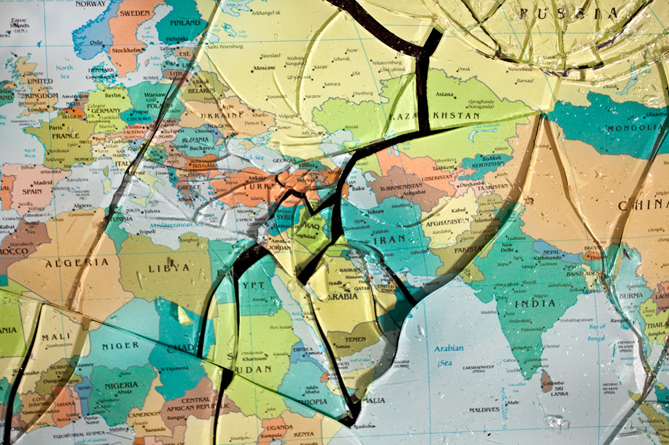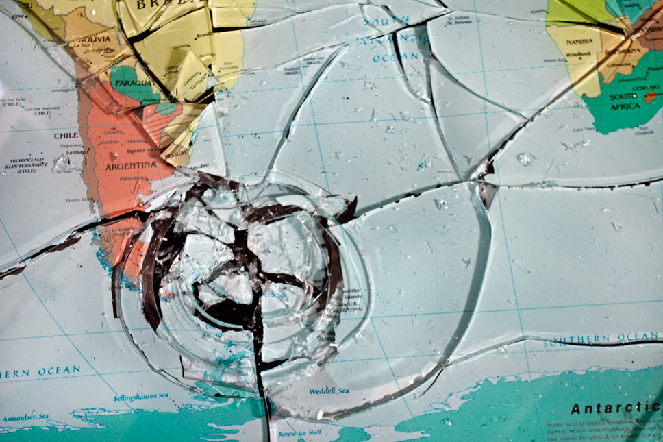 La instalación es bella y a través de elementos simples remite a varias capas de sentido. La sala se encuentra cubierta de varios centímetros de tierra fresca. Su envolvente aroma recuerda la energía que contiene, se percibe viva. Sobre ella, un planisferio de vidrio destrozado. El mapa del mundo fue impreso en él, en un colorido dibujo desplegado a través de toda su extensión. En una instancia performática que la artista ha mantenido en privado, y en la misma sala, tuvo lugar el rompimiento del mapa.