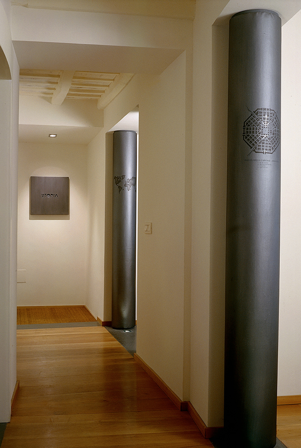 Dalla lettura del testo Inés Fontenla ricostruisce i luoghi e gli spazi dell’isola Utopia in un iter dal macro al micro che si svolge, come grazie ad uno zoom, attraverso quattro colonne brillanti di un grigio grafite che, da un corridoio, a due a due, l’una di fronte all’altra, guardano l’ingresso a due vani dell’abitazione: sulla prima colonna viene rappresentata l’isola nella mappa del mondo, nella seconda l’isola stessa con le sue città, nella terza la pianta della capitale e nella quarta un palazzo di quest’ultima; infine, da una parte e dall’altra del corridoio, due pannelli di legno, sempre dipinti con grafite, mostrano uno il titolo dell’opera, l’altro alcuni testi di Tommaso Moro sotto ad una sfera vuota dove ognuno può ubicare la propria Utopia.